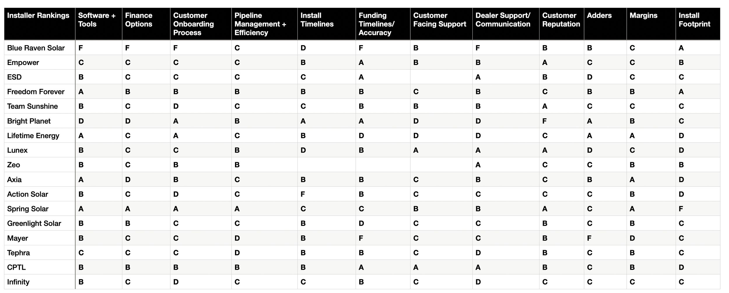 This report card was generated based off of hundreds of deals funneled through each of these installers. Some rankings may be blank due to lacking enough data to give a fair score. Rankings change over time.